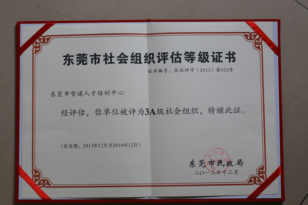 根據(jù)《社會組織評估管理辦法》(民政部令[2010]第39號)的規(guī)定,社會組織評估委員會委托第三方評估機構(gòu),自2013年4月開始,對智通學(xué)習(xí)進(jìn)行了等級評估。經(jīng)智通學(xué)習(xí)自評、評估和評估委員會審定。2013年12月18日,經(jīng)評估復(fù)核委員會審核、由市民政局確認(rèn),智通學(xué)習(xí)榮獲了3A社會組織等級資質(zhì)。