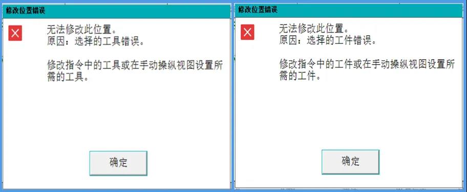 大家都知道,當手動操縱頁面當前所選擇的工具坐標系、工件坐標系與程序編輯器頁面中運動指令語句中所指定的工具坐標系、工件坐標系不完全相同時,是無法在程序編輯器頁面對運動指令的目標點位進行【修改位置】操作的,否則系統會提示下圖所示的的錯誤。