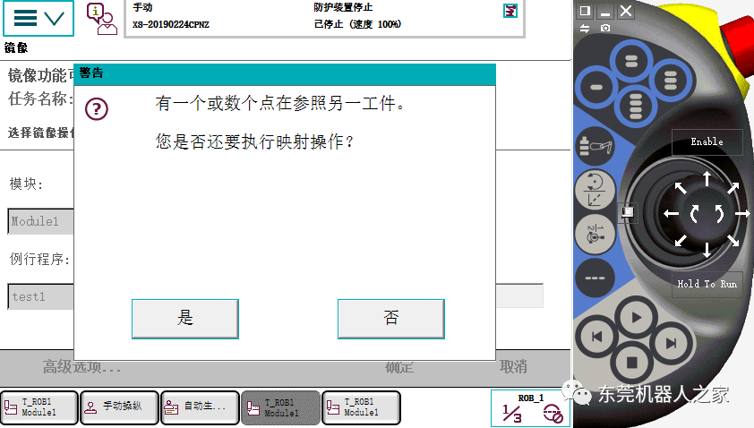 高級選項——先去掉基座鏡像前面的對勾——工件坐標(biāo)選擇wobj1,需鏡像的軸默認(rèn)X,(即延wobj1的xz面鏡像)——再在基座鏡像前面對勾打上——確定如下圖:
